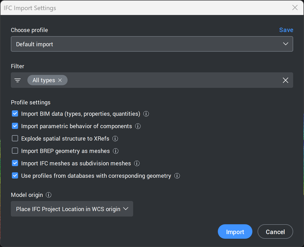 IFC importing process includes a dialog box with BIM data import settings. To facilitate managing and filtering BIM data, users can choose import profiles, filters, and model origins.