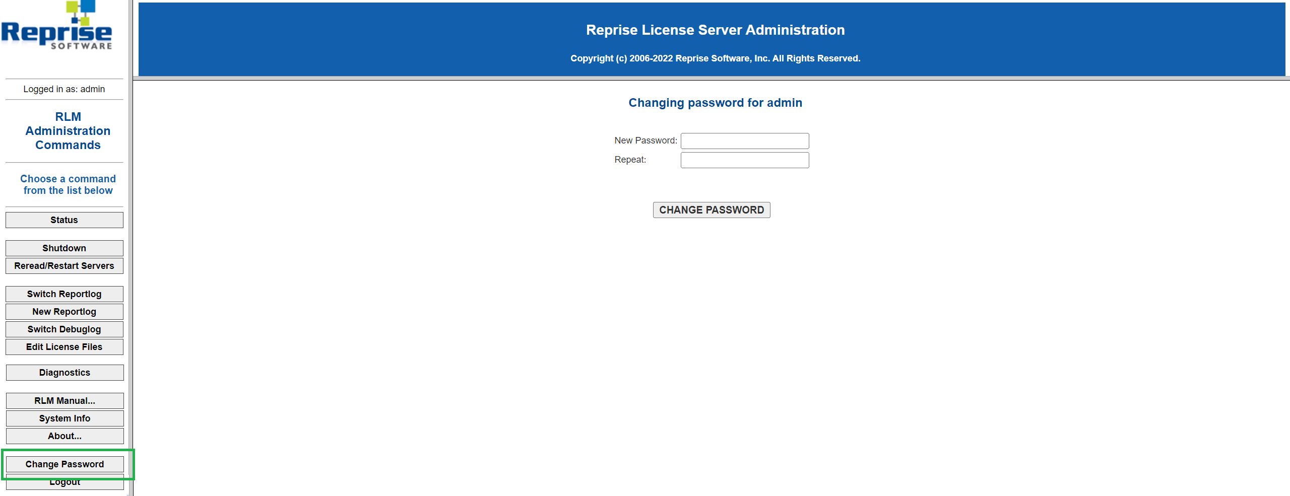If you don't have open Reprise Software window, then you can find it if you click on the License Server Administration shortcut in the Start menu. The opening window will be displayed as this one below.