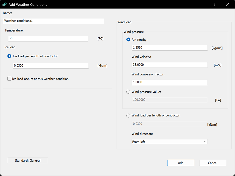 – Wind load per length of conductor: manual entry of wind load per unit length [kN/m].