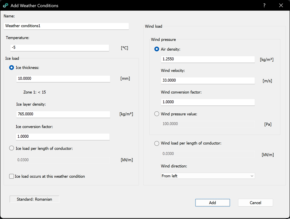 – Ice thickness: ice thickness used by the Romanian standard [mm].