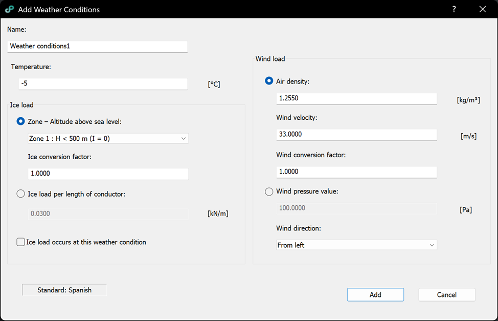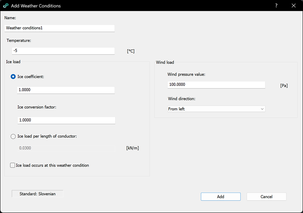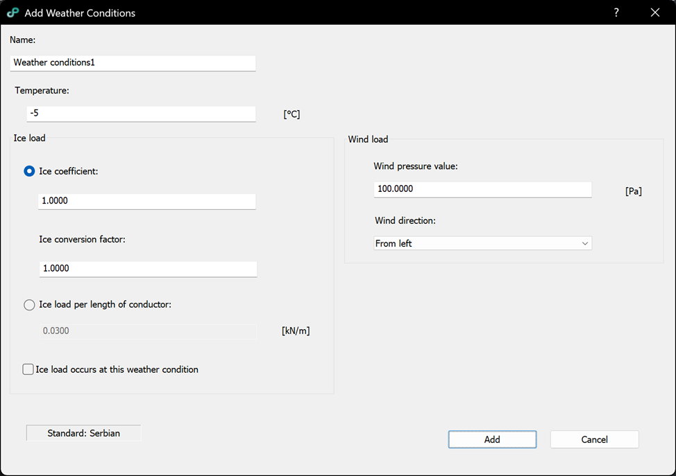 – Ice coefficient: coefficient defined by the Serbian standard and used to calculate the ice load for the selected conditions.