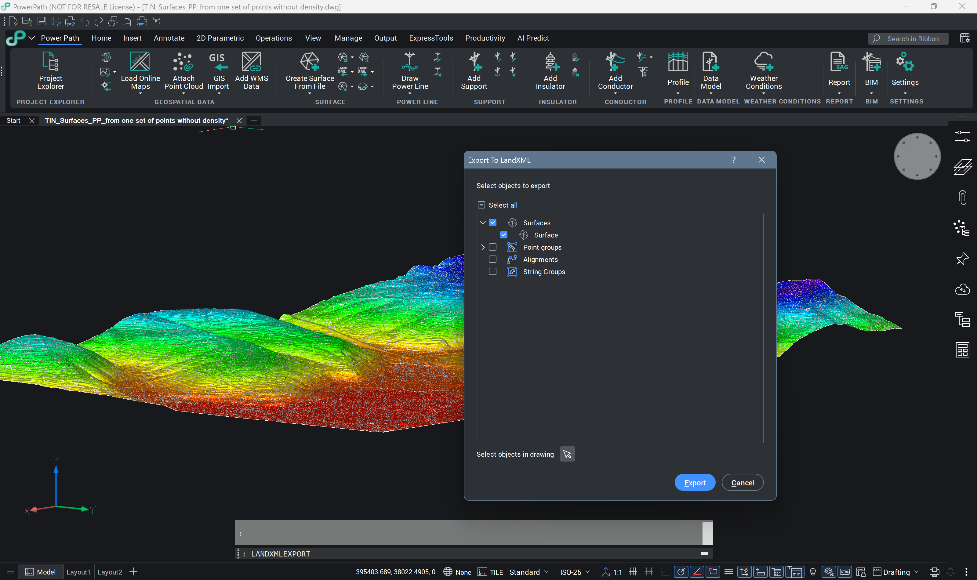 Enables exporting surface objects to LandXML (.xml) format for data exchange with other solutions.